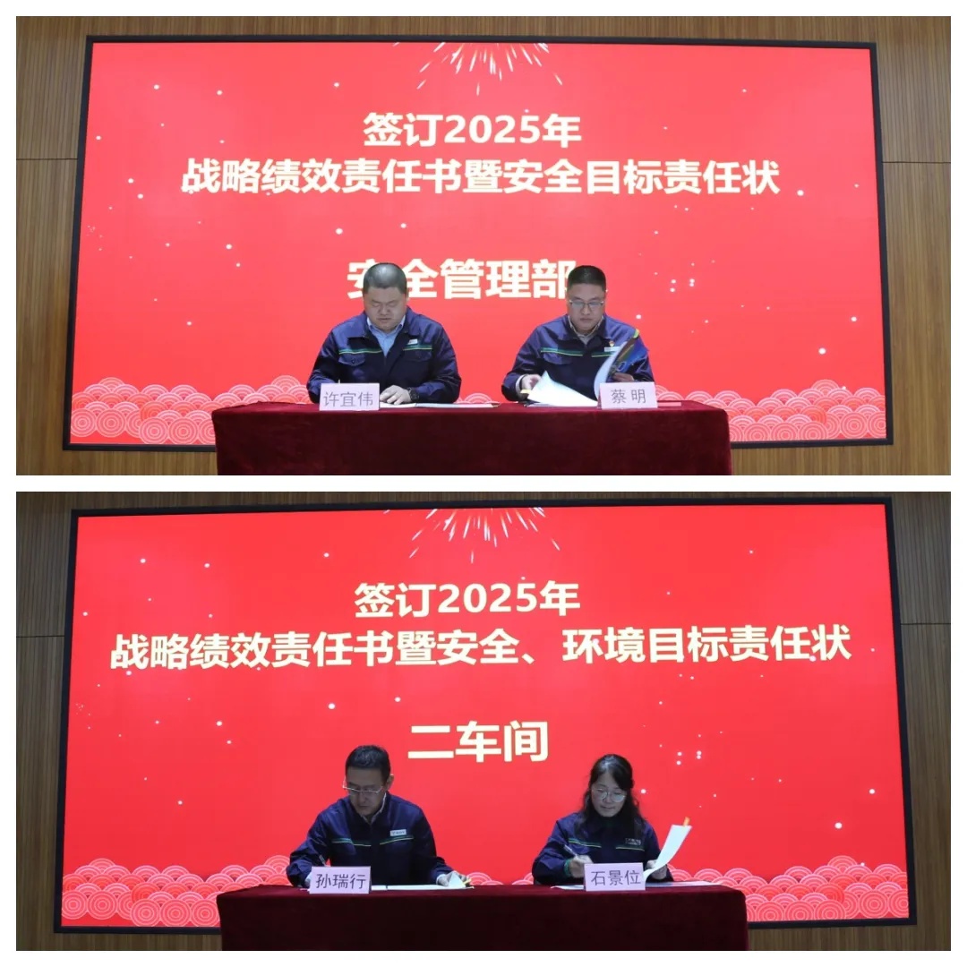 為扎實(shí)推進(jìn)落實(shí)2025年各項(xiàng)工作任務(wù),總經(jīng)理許宜偉分別與安全、環(huán)保、物流、生產(chǎn)管理分管領(lǐng)導(dǎo)簽訂了績(jī)效責(zé)任書(shū)及安全、環(huán)境責(zé)任狀。副總經(jīng)理孫瑞行與車(chē)間代表五車(chē)間、二車(chē)間簽訂了責(zé)任書(shū)。